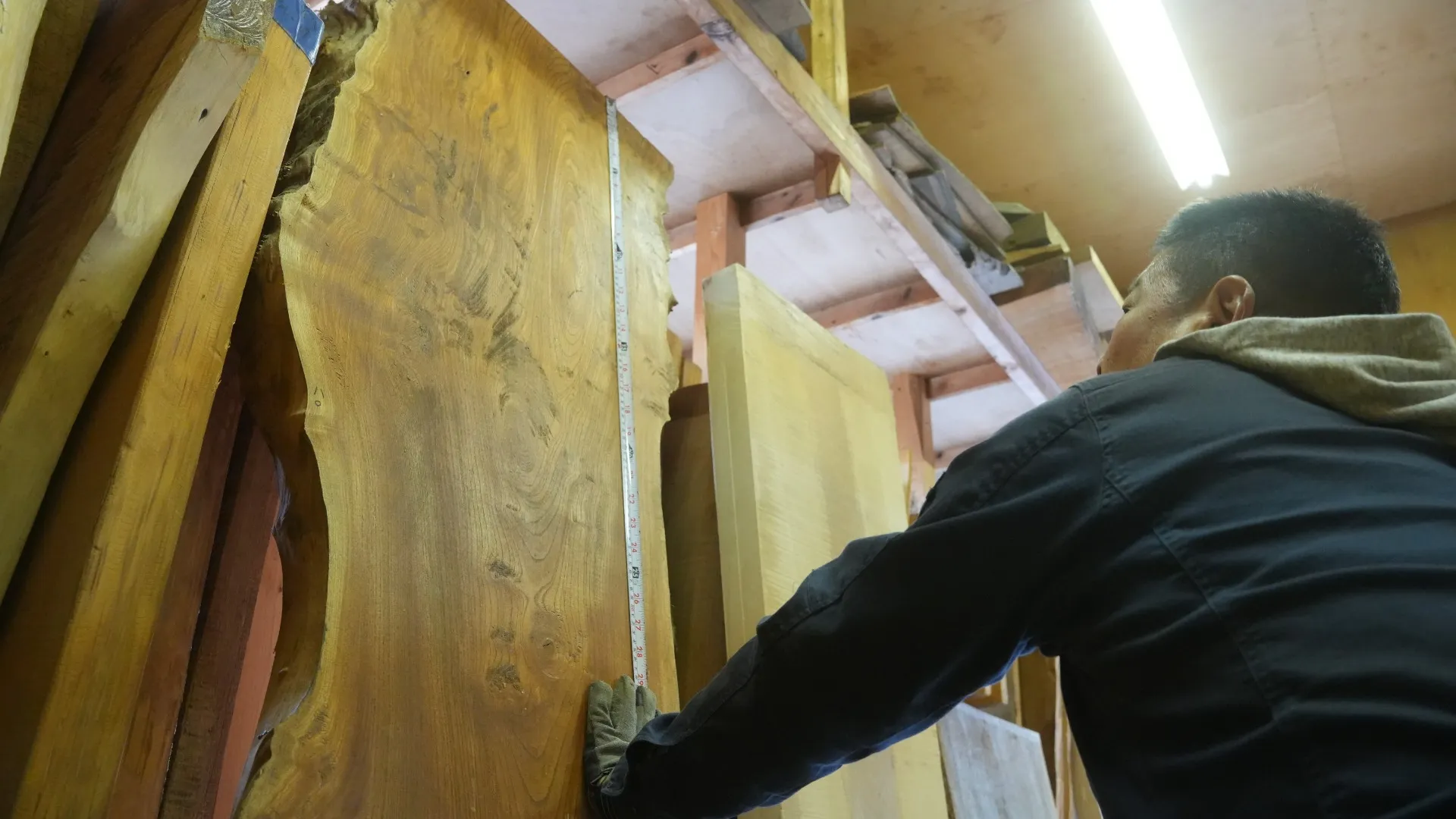 銘木と向き合い続けて五十年、積み重ねてきた経験の中で木の魅力と奥深さを学んできました。一本一本の木には異なる表情があり、それぞれの特性を見極めることが何より大切です。長年培ってきた感覚と確かな技術で、お客様のご要望に応じた木材を丁寧に仕立てています。時代が変わっても、木と真摯に向き合う姿勢は変わりません。これからも信頼に応えるものづくりを続けてまいります。